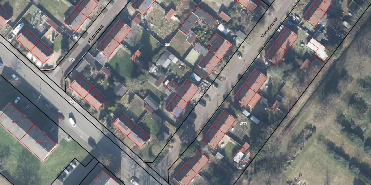 Het perceel waarop Venusstraat 26 staat heeft een oppervlakte van 6630 m². Dit is een zeer groot perceel. De perceeloppervlakte wordt geregistreerd door het Kadaster. Gedetailleerde informatie over de maten van dit perceel kunt u vinden in het rapport Kadastrale kaart met maatvoering van Venusstraat 26.