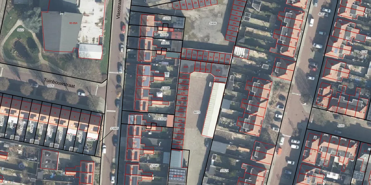 Het perceel waarop Vlasstraat 43-N staat heeft een oppervlakte van 1866 m². Dit is een zeer groot perceel. De perceeloppervlakte wordt geregistreerd door het Kadaster. Gedetailleerde informatie over de maten van dit perceel kunt u vinden in het rapport Kadastrale kaart met maatvoering van Vlasstraat 43-N.