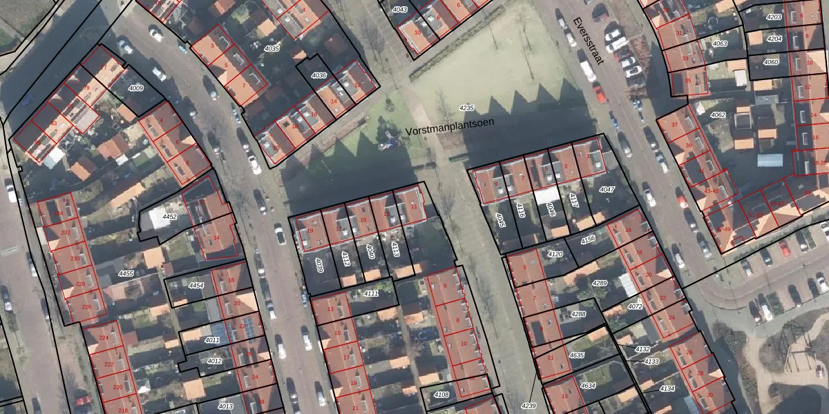 Het perceel waarop Vorstmanplantsoen 11 staat heeft een oppervlakte van 2972 m². Dit is een zeer groot perceel. De perceeloppervlakte wordt geregistreerd door het Kadaster. Gedetailleerde informatie over de maten van dit perceel kunt u vinden in het rapport Kadastrale kaart met maatvoering van Vorstmanplantsoen 11.