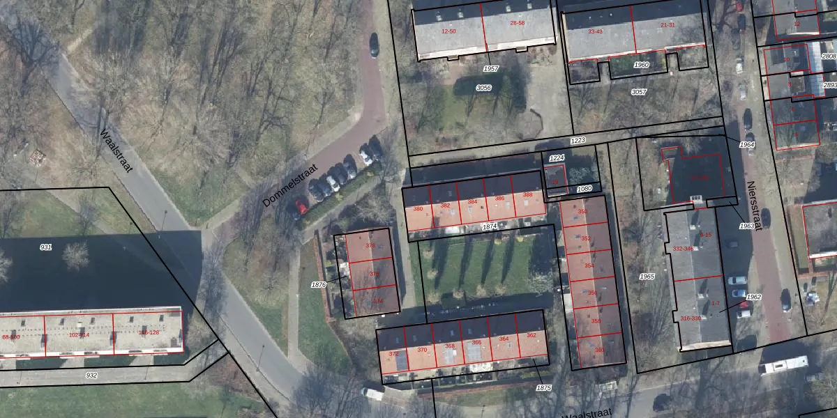 Het perceel waarop Waalstraat 380 staat heeft een oppervlakte van 959 m². Dit is een groot perceel. De perceeloppervlakte wordt geregistreerd door het Kadaster. Gedetailleerde informatie over de maten van dit perceel kunt u vinden in het rapport Kadastrale kaart met maatvoering van Waalstraat 380.