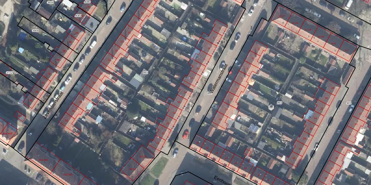 Het perceel waarop Watermanstraat 14 staat heeft een oppervlakte van 7990 m². Dit is een zeer groot perceel. De perceeloppervlakte wordt geregistreerd door het Kadaster. Gedetailleerde informatie over de maten van dit perceel kunt u vinden in het rapport Kadastrale kaart met maatvoering van Watermanstraat 14.