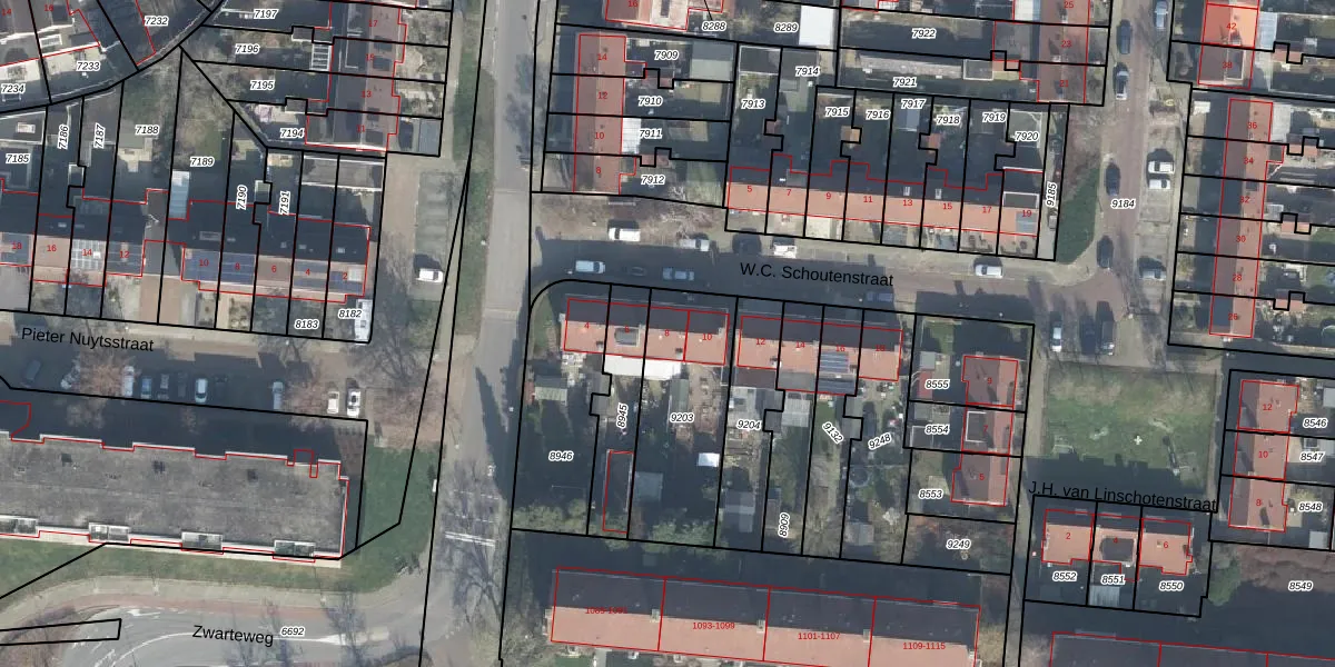 Het perceel waarop W.C. Schoutenstraat 8 staat heeft een oppervlakte van 500 m². Dit is een groot perceel. De perceeloppervlakte wordt geregistreerd door het Kadaster. Gedetailleerde informatie over de maten van dit perceel kunt u vinden in het rapport Kadastrale kaart met maatvoering van W.C. Schoutenstraat 8.
