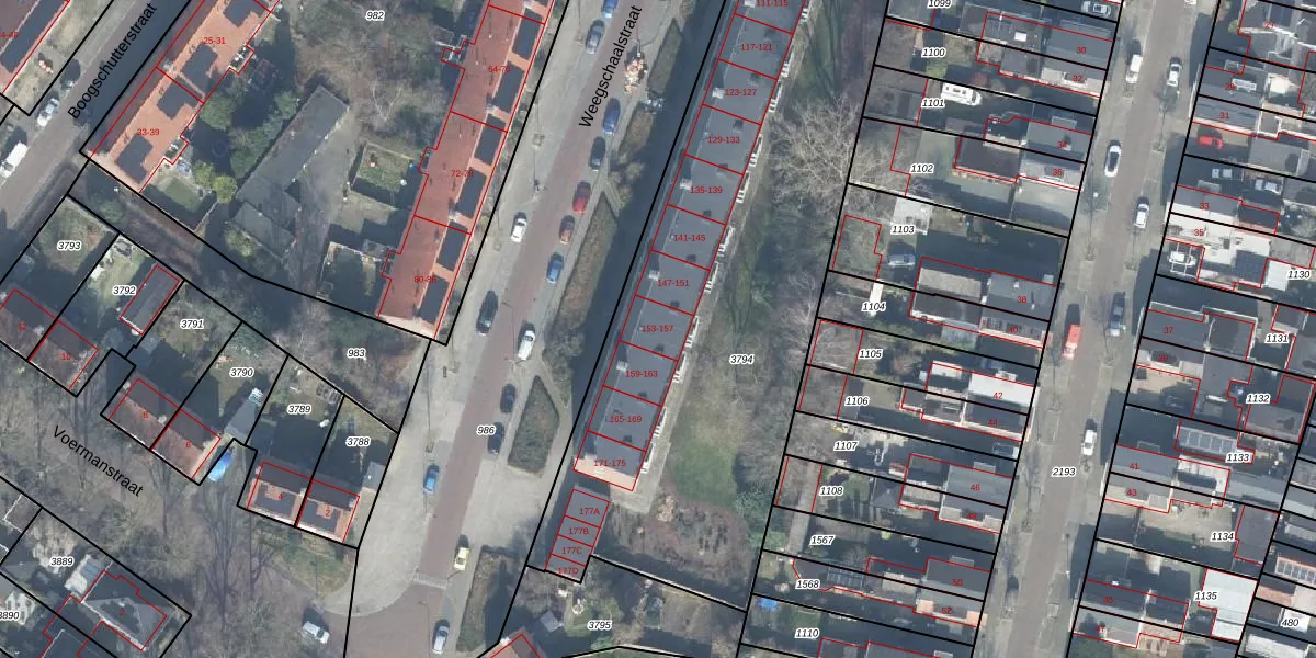 Het perceel waarop Weegschaalstraat 155 staat heeft een oppervlakte van 4150 m². Dit is een zeer groot perceel. De perceeloppervlakte wordt geregistreerd door het Kadaster. Gedetailleerde informatie over de maten van dit perceel kunt u vinden in het rapport Kadastrale kaart met maatvoering van Weegschaalstraat 155.
