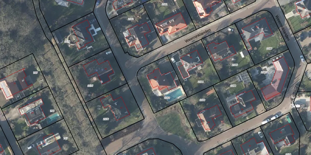 Weerninklanden 30 is gelegen op kadastraal perceel LNK00P2163. Deze kadastrale aanduiding is uniek en wordt gebruikt door het Kadaster om eigendomsrechten en andere zakelijke rechten vast te leggen. Het perceel maakt onderdeel uit van de kadastrale gemeente Lonneker.