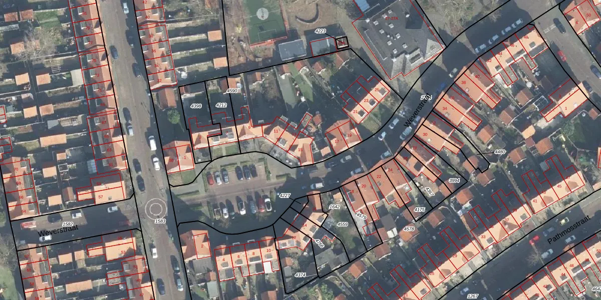 Weverstraat 15 is gelegen op kadastraal perceel ESD00G4590. Deze kadastrale aanduiding is uniek en wordt gebruikt door het Kadaster om eigendomsrechten en andere zakelijke rechten vast te leggen. Het perceel maakt onderdeel uit van de kadastrale gemeente Enschede.