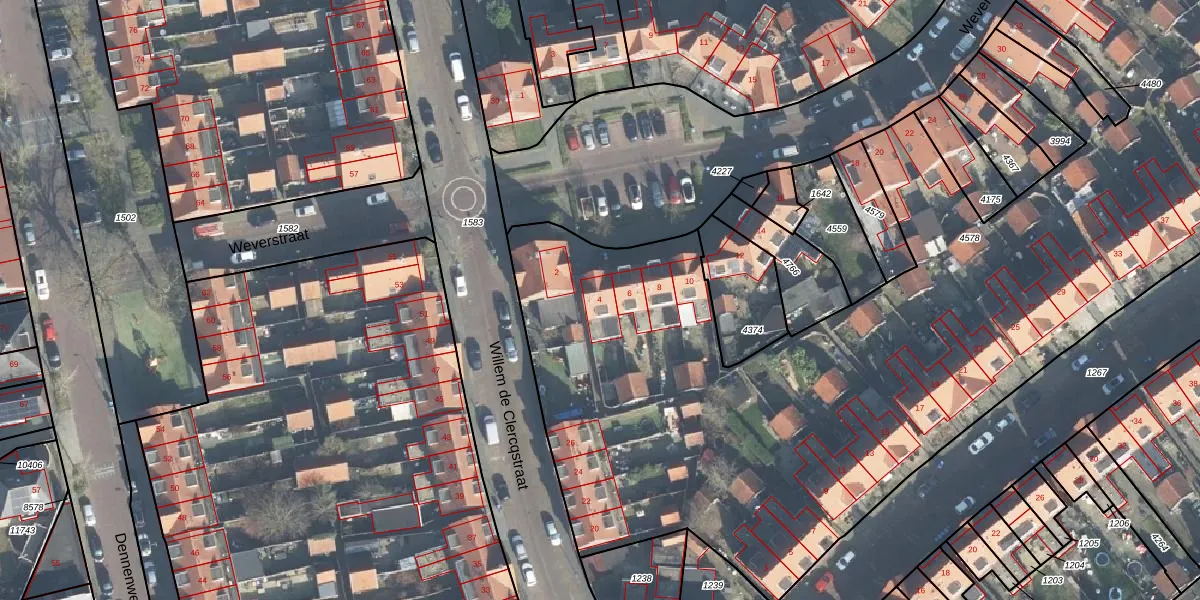 Het perceel waarop Weverstraat 4 staat heeft een oppervlakte van 6928 m². Dit is een zeer groot perceel. De perceeloppervlakte wordt geregistreerd door het Kadaster. Gedetailleerde informatie over de maten van dit perceel kunt u vinden in het rapport Kadastrale kaart met maatvoering van Weverstraat 4.