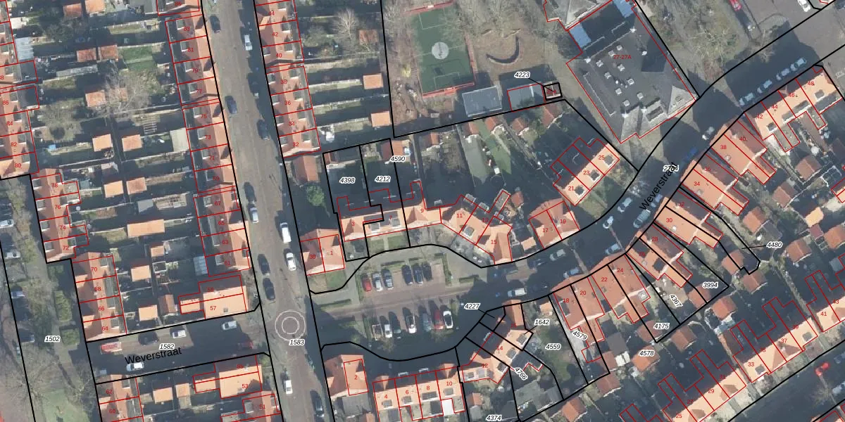 Het perceel waarop Weverstraat 9 staat heeft een oppervlakte van 3771 m². Dit is een zeer groot perceel. De perceeloppervlakte wordt geregistreerd door het Kadaster. Gedetailleerde informatie over de maten van dit perceel kunt u vinden in het rapport Kadastrale kaart met maatvoering van Weverstraat 9.