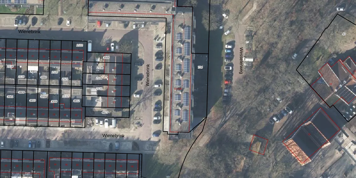 Het perceel waarop Wienebrink 52 staat heeft een oppervlakte van 2080 m². Dit is een zeer groot perceel. De perceeloppervlakte wordt geregistreerd door het Kadaster. Gedetailleerde informatie over de maten van dit perceel kunt u vinden in het rapport Kadastrale kaart met maatvoering van Wienebrink 52.