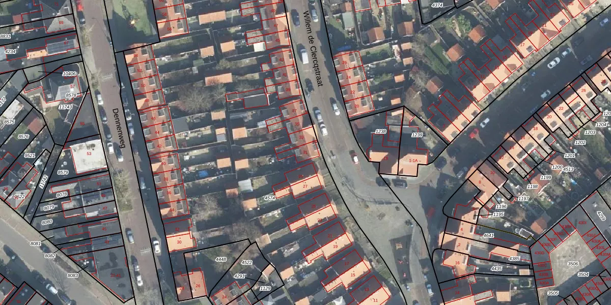 Het perceel waarop Willem de Clercqstraat 31 staat heeft een oppervlakte van 7712 m². Dit is een zeer groot perceel. De perceeloppervlakte wordt geregistreerd door het Kadaster. Gedetailleerde informatie over de maten van dit perceel kunt u vinden in het rapport Kadastrale kaart met maatvoering van Willem de Clercqstraat 31.