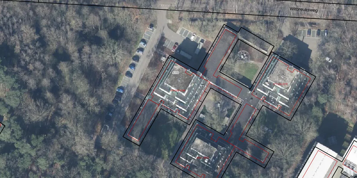 Het perceel waarop Witbreuksweg 379-307 staat heeft een oppervlakte van 3861 m². Dit is een zeer groot perceel. De perceeloppervlakte wordt geregistreerd door het Kadaster. Gedetailleerde informatie over de maten van dit perceel kunt u vinden in het rapport Kadastrale kaart met maatvoering van Witbreuksweg 379-307.