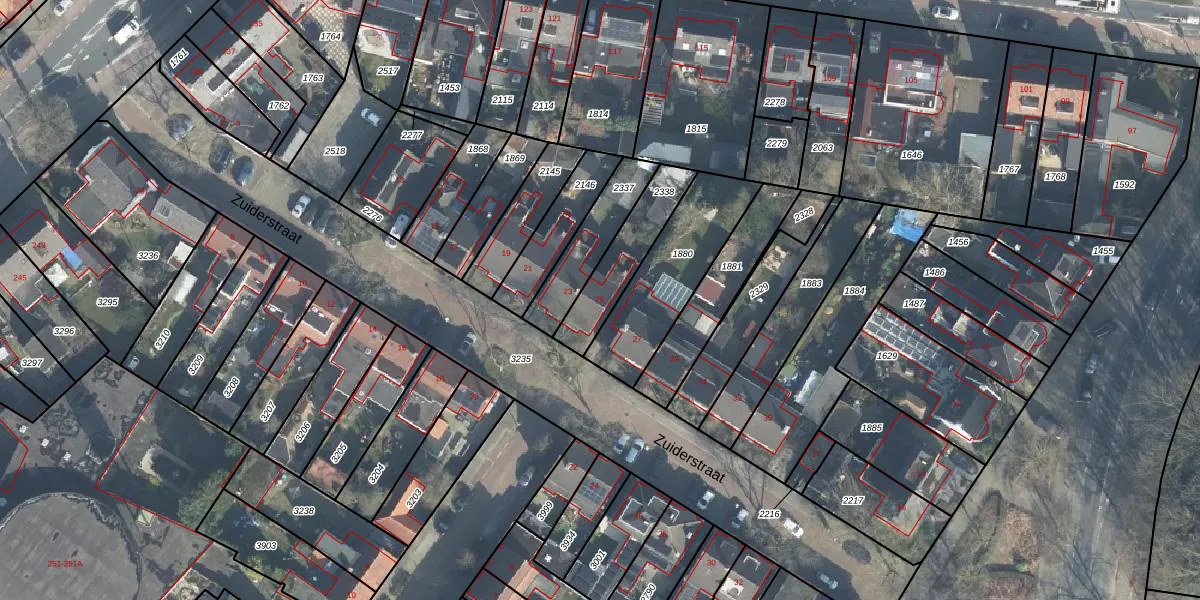 Het perceel waarop Zuiderstraat 25 staat heeft een oppervlakte van 215 m². Dit is een middelgroot perceel. De perceeloppervlakte wordt geregistreerd door het Kadaster. Gedetailleerde informatie over de maten van dit perceel kunt u vinden in het rapport Kadastrale kaart met maatvoering van Zuiderstraat 25.