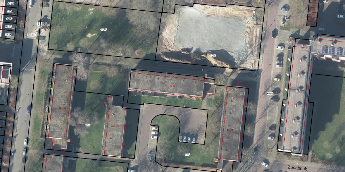 Het perceel waarop Zunabrink 58 staat heeft een oppervlakte van 2550 m². Dit is een zeer groot perceel. De perceeloppervlakte wordt geregistreerd door het Kadaster. Gedetailleerde informatie over de maten van dit perceel kunt u vinden in het rapport Kadastrale kaart met maatvoering van Zunabrink 58.