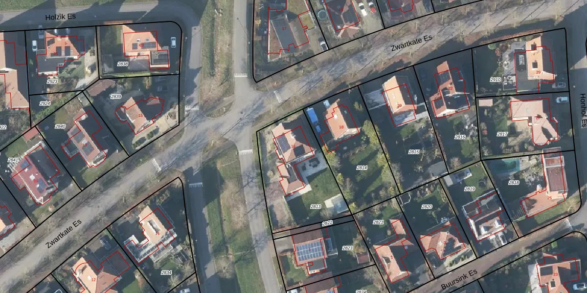 Zwartkate Es 16 is gelegen op kadastraal perceel LNK00AA2813. Deze kadastrale aanduiding is uniek en wordt gebruikt door het Kadaster om eigendomsrechten en andere zakelijke rechten vast te leggen. Het perceel maakt onderdeel uit van de kadastrale gemeente Lonneker.