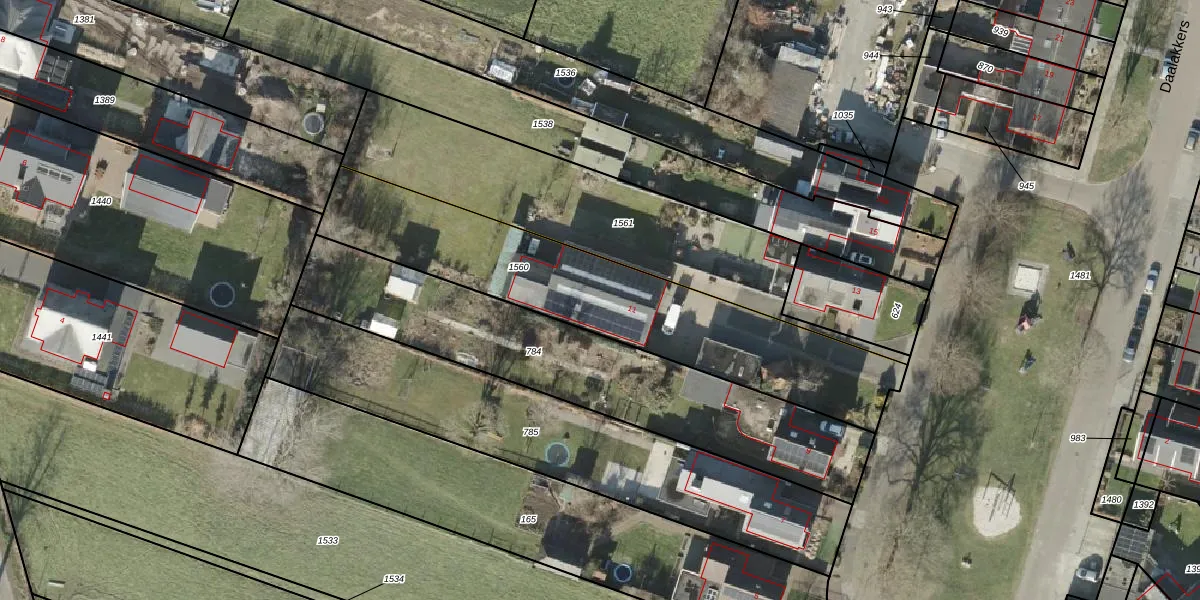 Het perceel waarop Daalakkers 11 staat heeft een oppervlakte van 1220 m². Dit is een zeer groot perceel. De perceeloppervlakte wordt geregistreerd door het Kadaster. Gedetailleerde informatie over de maten van dit perceel kunt u vinden in het rapport Kadastrale kaart met maatvoering van Daalakkers 11.