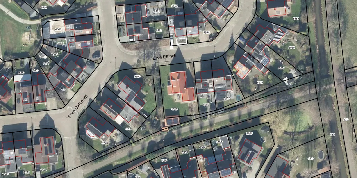 Het perceel waarop Erve Effinck 31 staat heeft een oppervlakte van 584 m². Dit is een groot perceel. De perceeloppervlakte wordt geregistreerd door het Kadaster. Gedetailleerde informatie over de maten van dit perceel kunt u vinden in het rapport Kadastrale kaart met maatvoering van Erve Effinck 31.