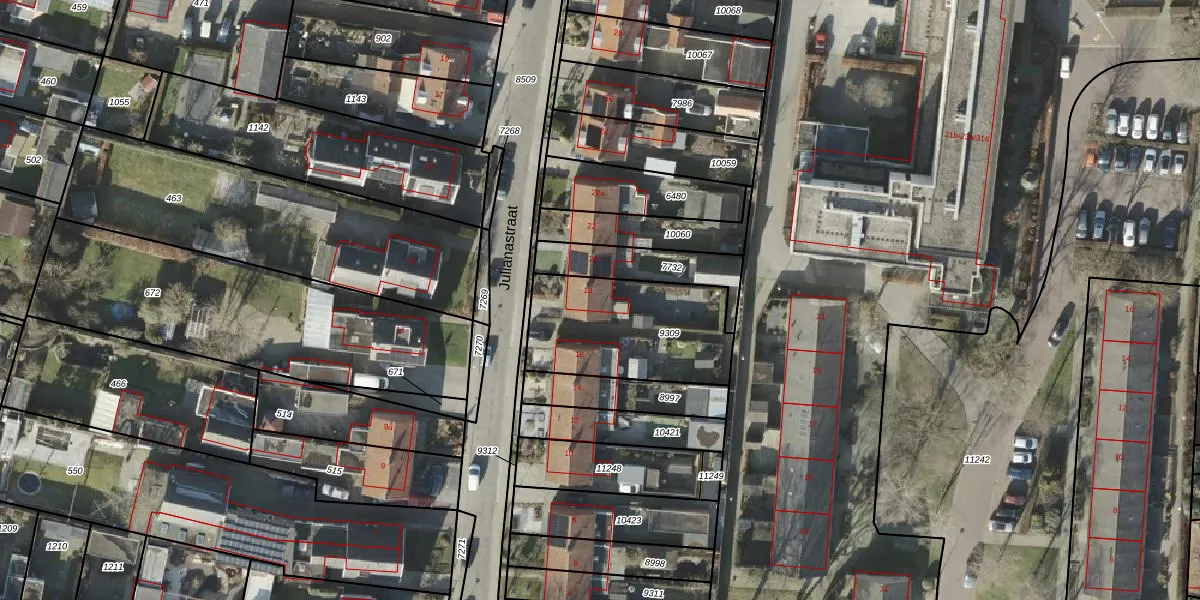 Het perceel waarop Julianastraat 18 staat heeft een oppervlakte van 548 m². Dit is een groot perceel. De perceeloppervlakte wordt geregistreerd door het Kadaster. Gedetailleerde informatie over de maten van dit perceel kunt u vinden in het rapport Kadastrale kaart met maatvoering van Julianastraat 18.