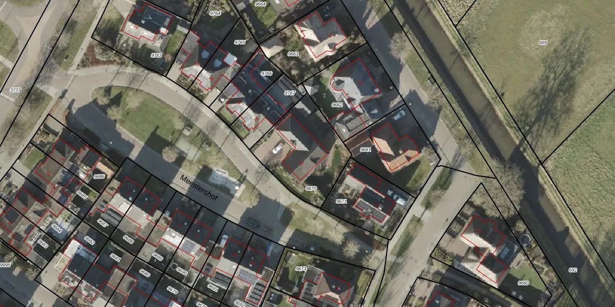 Het perceel waarop Meestershof 14 staat heeft een oppervlakte van 660 m². Dit is een groot perceel. De perceeloppervlakte wordt geregistreerd door het Kadaster. Gedetailleerde informatie over de maten van dit perceel kunt u vinden in het rapport Kadastrale kaart met maatvoering van Meestershof 14.