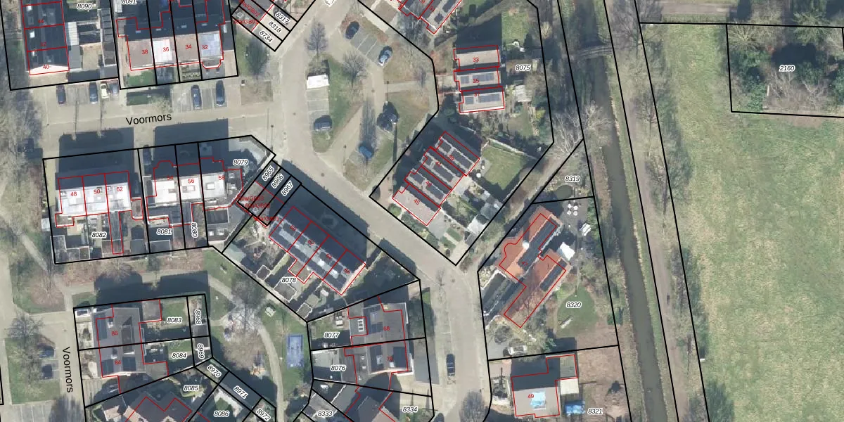 Het perceel waarop Voormors 45 staat heeft een oppervlakte van 2132 m². Dit is een zeer groot perceel. De perceeloppervlakte wordt geregistreerd door het Kadaster. Gedetailleerde informatie over de maten van dit perceel kunt u vinden in het rapport Kadastrale kaart met maatvoering van Voormors 45.