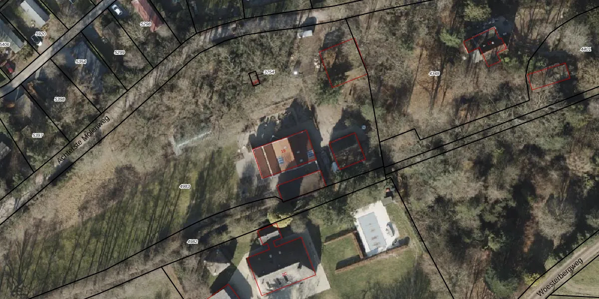 Het perceel waarop Achterste Molenweg 19 staat heeft een oppervlakte van 6205 m². Dit is een zeer groot perceel. De perceeloppervlakte wordt geregistreerd door het Kadaster. Gedetailleerde informatie over de maten van dit perceel kunt u vinden in het rapport Kadastrale kaart met maatvoering van Achterste Molenweg 19.