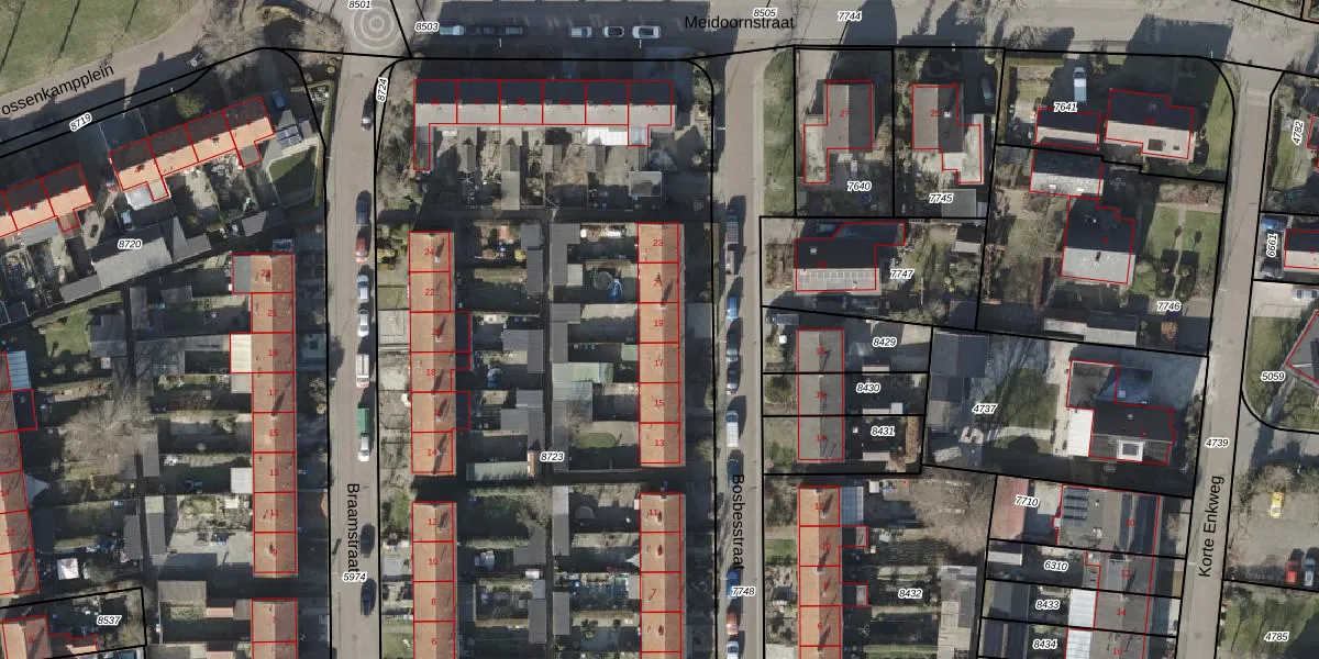 Het perceel waarop Bosbesstraat 19 staat heeft een oppervlakte van 6045 m². Dit is een zeer groot perceel. De perceeloppervlakte wordt geregistreerd door het Kadaster. Gedetailleerde informatie over de maten van dit perceel kunt u vinden in het rapport Kadastrale kaart met maatvoering van Bosbesstraat 19.