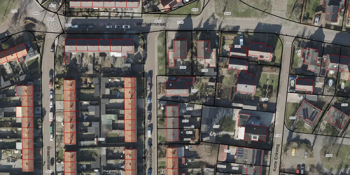 Het perceel waarop Bosbesstraat 20 staat heeft een oppervlakte van 484 m². Dit is een groot perceel. De perceeloppervlakte wordt geregistreerd door het Kadaster. Gedetailleerde informatie over de maten van dit perceel kunt u vinden in het rapport Kadastrale kaart met maatvoering van Bosbesstraat 20.