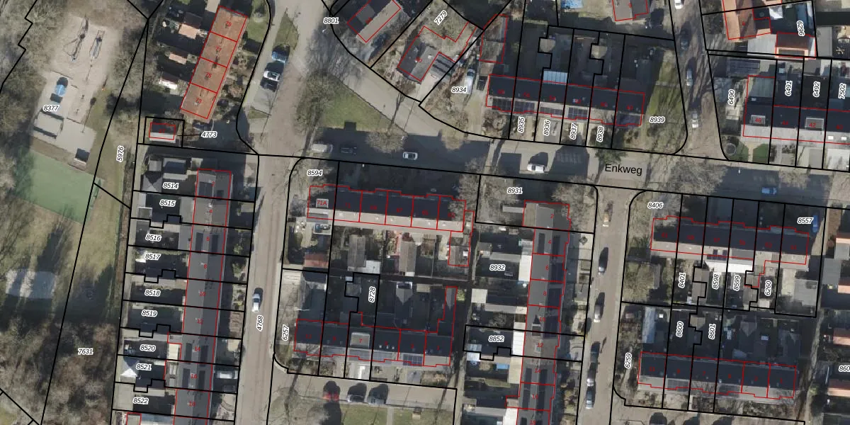 Het perceel waarop Enkweg 65 staat heeft een oppervlakte van 3062 m². Dit is een zeer groot perceel. De perceeloppervlakte wordt geregistreerd door het Kadaster. Gedetailleerde informatie over de maten van dit perceel kunt u vinden in het rapport Kadastrale kaart met maatvoering van Enkweg 65.