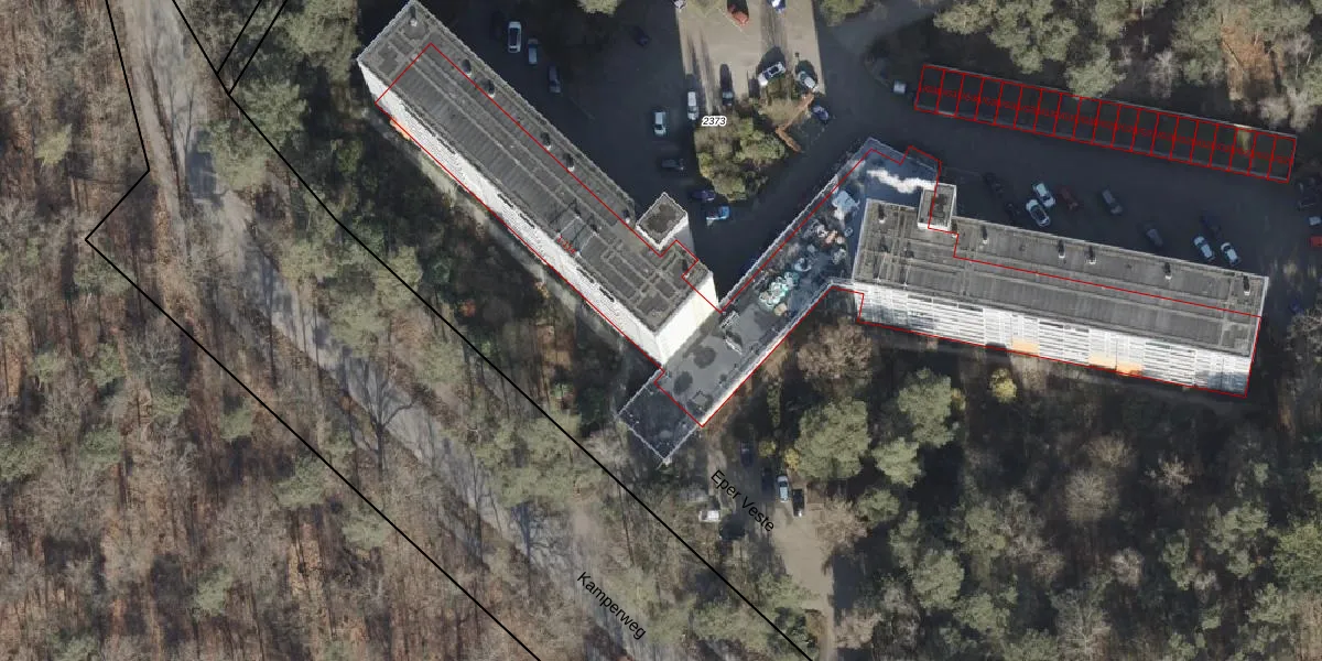 Het perceel waarop Eper Veste 21 staat heeft een oppervlakte van 2,7 ha. Dit is een zeer groot perceel. De perceeloppervlakte wordt geregistreerd door het Kadaster. Gedetailleerde informatie over de maten van dit perceel kunt u vinden in het rapport Kadastrale kaart met maatvoering van Eper Veste 21.