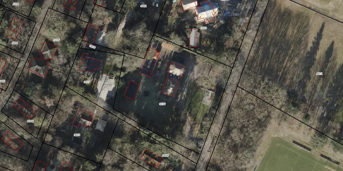 Het perceel waarop Ericaweg 25 staat heeft een oppervlakte van 2937 m². Dit is een zeer groot perceel. De perceeloppervlakte wordt geregistreerd door het Kadaster. Gedetailleerde informatie over de maten van dit perceel kunt u vinden in het rapport Kadastrale kaart met maatvoering van Ericaweg 25.