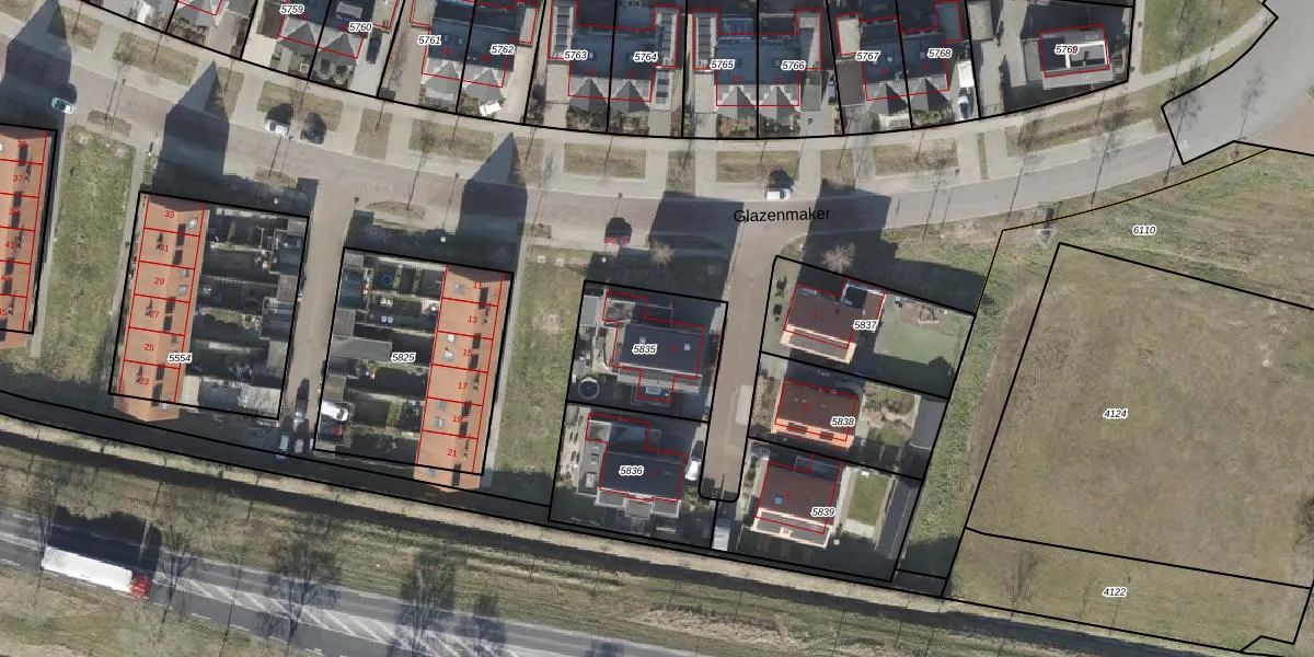 Het perceel waarop Glazenmaker 9 staat heeft een oppervlakte van 406 m². Dit is een groot perceel. De perceeloppervlakte wordt geregistreerd door het Kadaster. Gedetailleerde informatie over de maten van dit perceel kunt u vinden in het rapport Kadastrale kaart met maatvoering van Glazenmaker 9.