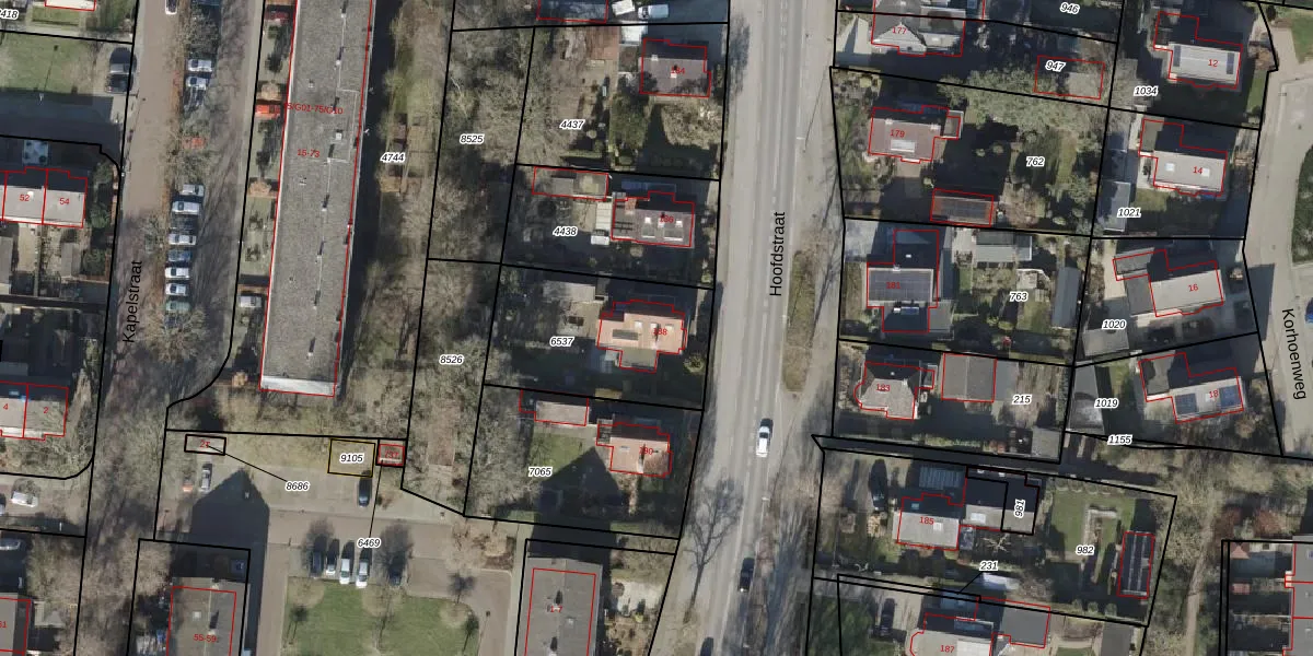 Het perceel waarop Hoofdstraat 188 staat heeft een oppervlakte van 615 m². Dit is een groot perceel. De perceeloppervlakte wordt geregistreerd door het Kadaster. Gedetailleerde informatie over de maten van dit perceel kunt u vinden in het rapport Kadastrale kaart met maatvoering van Hoofdstraat 188.