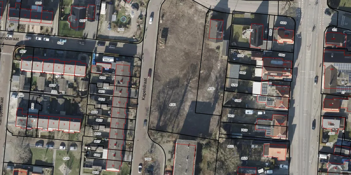 Het perceel waarop Kapelstraat 1-19 staat heeft een oppervlakte van 2230 m². Dit is een zeer groot perceel. De perceeloppervlakte wordt geregistreerd door het Kadaster. Gedetailleerde informatie over de maten van dit perceel kunt u vinden in het rapport Kadastrale kaart met maatvoering van Kapelstraat 1-19.