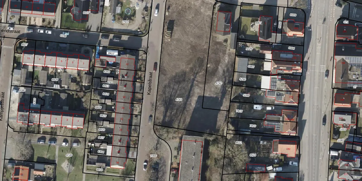 Het perceel waarop Kapelstraat 1-20 staat heeft een oppervlakte van 2230 m². Dit is een zeer groot perceel. De perceeloppervlakte wordt geregistreerd door het Kadaster. Gedetailleerde informatie over de maten van dit perceel kunt u vinden in het rapport Kadastrale kaart met maatvoering van Kapelstraat 1-20.