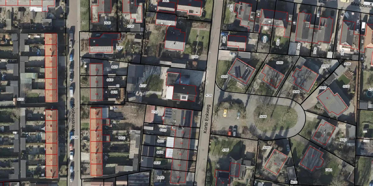 Het perceel waarop Korte Enkweg 6 staat heeft een oppervlakte van 895 m². Dit is een groot perceel. De perceeloppervlakte wordt geregistreerd door het Kadaster. Gedetailleerde informatie over de maten van dit perceel kunt u vinden in het rapport Kadastrale kaart met maatvoering van Korte Enkweg 6.
