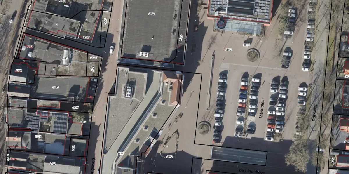 Het perceel waarop Marktplein 4-A staat heeft een oppervlakte van 2836 m². Dit is een zeer groot perceel. De perceeloppervlakte wordt geregistreerd door het Kadaster. Gedetailleerde informatie over de maten van dit perceel kunt u vinden in het rapport Kadastrale kaart met maatvoering van Marktplein 4-A.
