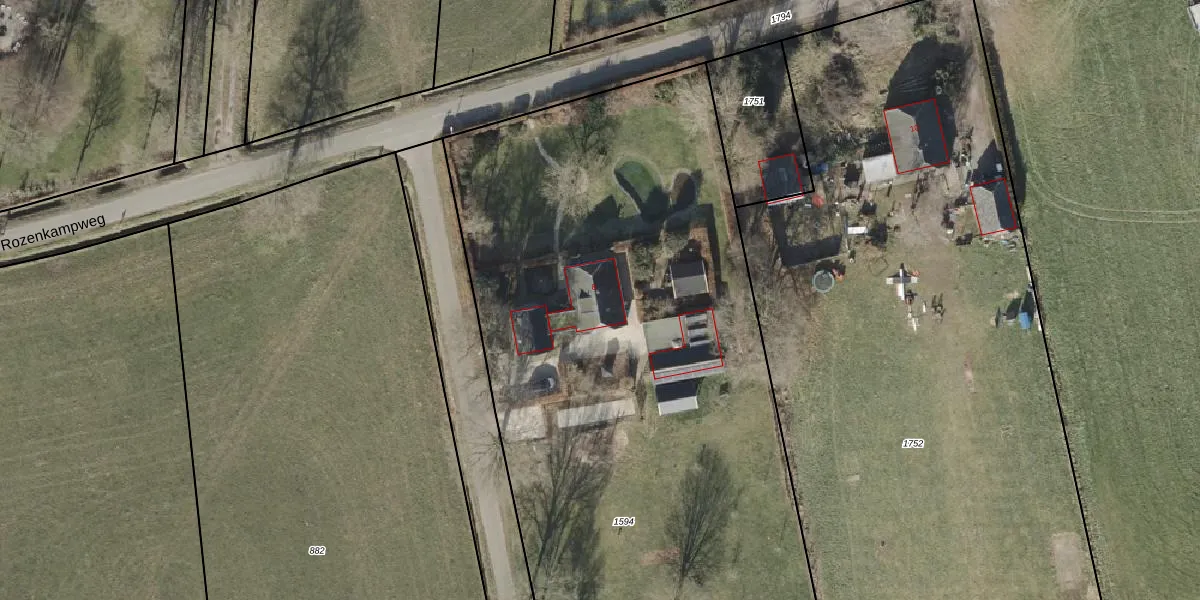 Het perceel waarop Rozenkampweg 8 staat heeft een oppervlakte van 5870 m². Dit is een zeer groot perceel. De perceeloppervlakte wordt geregistreerd door het Kadaster. Gedetailleerde informatie over de maten van dit perceel kunt u vinden in het rapport Kadastrale kaart met maatvoering van Rozenkampweg 8.
