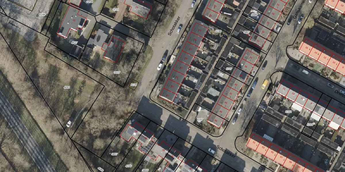 Het perceel waarop Schotakker 45 staat heeft een oppervlakte van 4051 m². Dit is een zeer groot perceel. De perceeloppervlakte wordt geregistreerd door het Kadaster. Gedetailleerde informatie over de maten van dit perceel kunt u vinden in het rapport Kadastrale kaart met maatvoering van Schotakker 45.
