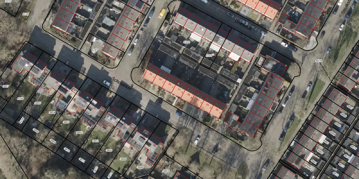 Het perceel waarop Schotakker 57 staat heeft een oppervlakte van 4143 m². Dit is een zeer groot perceel. De perceeloppervlakte wordt geregistreerd door het Kadaster. Gedetailleerde informatie over de maten van dit perceel kunt u vinden in het rapport Kadastrale kaart met maatvoering van Schotakker 57.