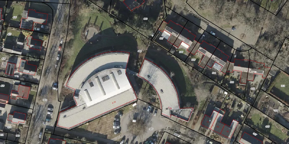 Het perceel waarop Sint Catharinaweg 1 staat heeft een oppervlakte van 7000 m². Dit is een zeer groot perceel. De perceeloppervlakte wordt geregistreerd door het Kadaster. Gedetailleerde informatie over de maten van dit perceel kunt u vinden in het rapport Kadastrale kaart met maatvoering van Sint Catharinaweg 1.