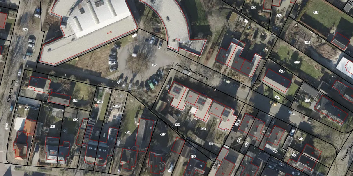 Het perceel waarop Sint Catharinaweg 14 staat heeft een oppervlakte van 1430 m². Dit is een zeer groot perceel. De perceeloppervlakte wordt geregistreerd door het Kadaster. Gedetailleerde informatie over de maten van dit perceel kunt u vinden in het rapport Kadastrale kaart met maatvoering van Sint Catharinaweg 14.