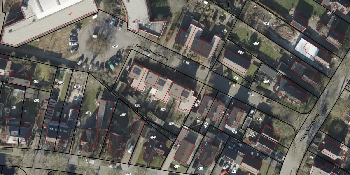 Het perceel waarop Sint Catharinaweg 20 staat heeft een oppervlakte van 1430 m². Dit is een zeer groot perceel. De perceeloppervlakte wordt geregistreerd door het Kadaster. Gedetailleerde informatie over de maten van dit perceel kunt u vinden in het rapport Kadastrale kaart met maatvoering van Sint Catharinaweg 20.