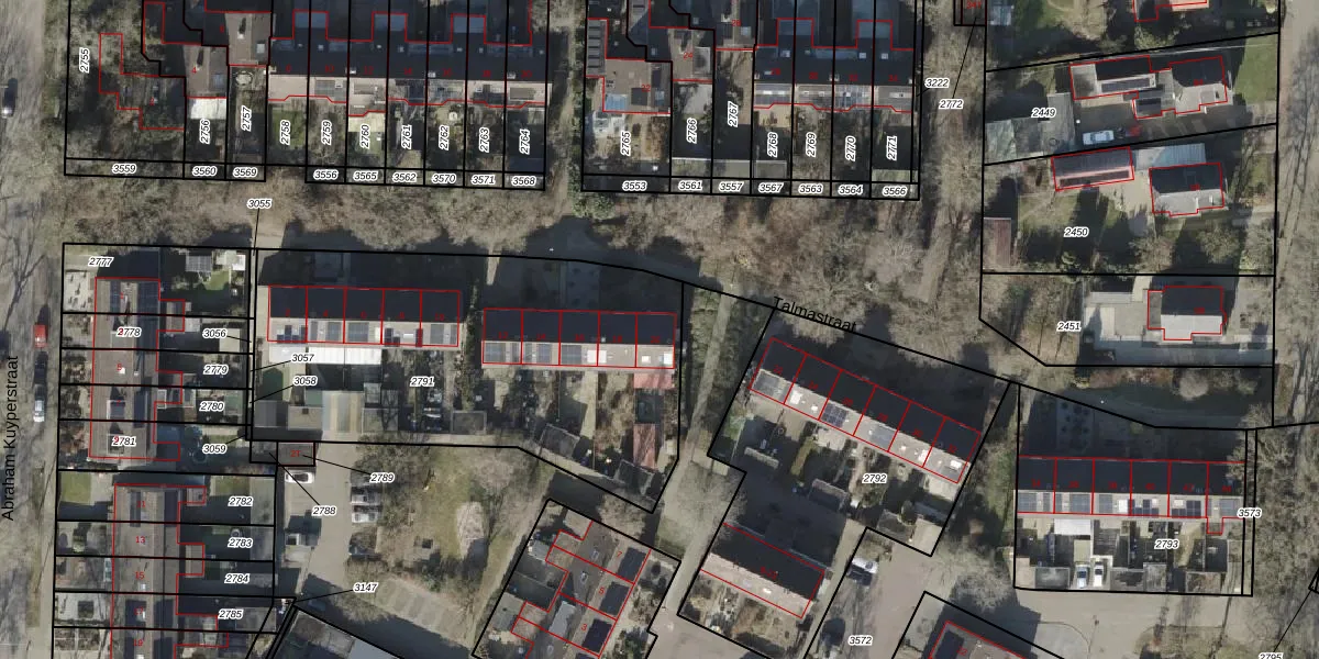 Het perceel waarop Talmastraat 20 staat heeft een oppervlakte van 1985 m². Dit is een zeer groot perceel. De perceeloppervlakte wordt geregistreerd door het Kadaster. Gedetailleerde informatie over de maten van dit perceel kunt u vinden in het rapport Kadastrale kaart met maatvoering van Talmastraat 20.