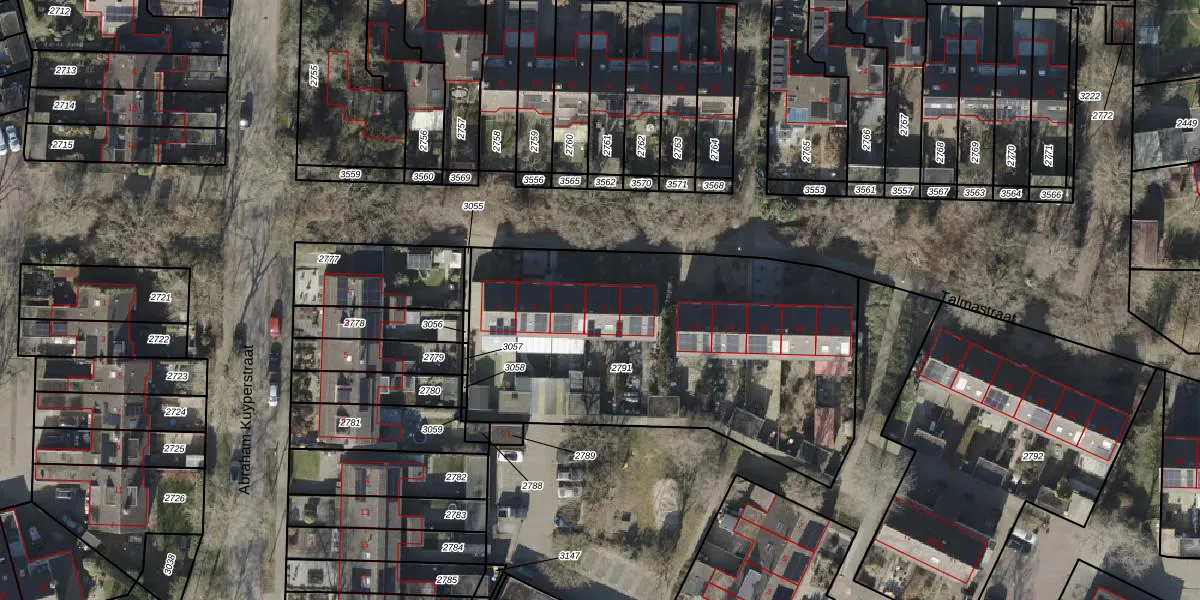 Het perceel waarop Talmastraat 8 staat heeft een oppervlakte van 1985 m². Dit is een zeer groot perceel. De perceeloppervlakte wordt geregistreerd door het Kadaster. Gedetailleerde informatie over de maten van dit perceel kunt u vinden in het rapport Kadastrale kaart met maatvoering van Talmastraat 8.