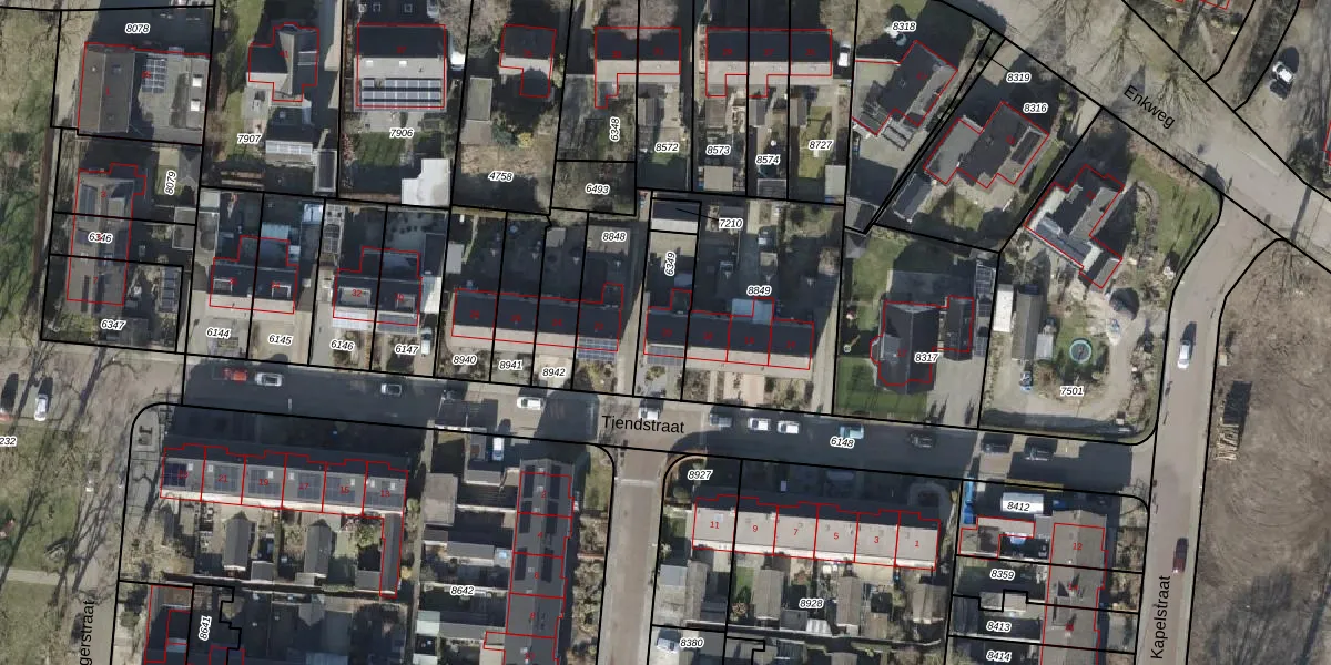Het perceel waarop Tiendstraat 20 staat heeft een oppervlakte van 185 m². Dit is een middelgroot perceel. De perceeloppervlakte wordt geregistreerd door het Kadaster. Gedetailleerde informatie over de maten van dit perceel kunt u vinden in het rapport Kadastrale kaart met maatvoering van Tiendstraat 20.