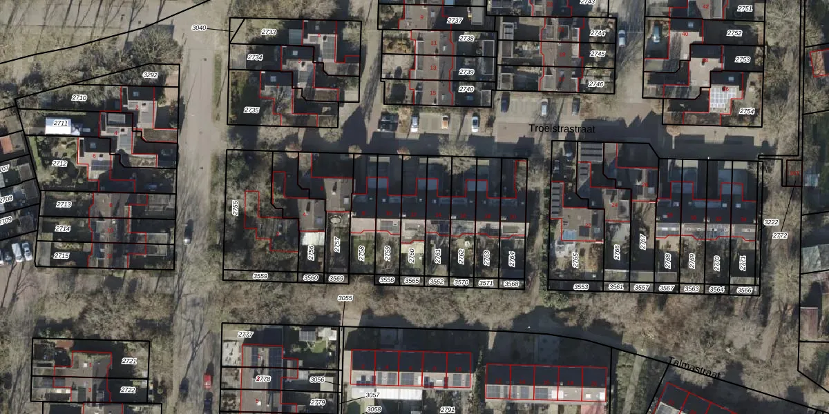 Het perceel waarop Troelstrastraat 12 staat heeft een oppervlakte van 174 m². Dit is een middelgroot perceel. De perceeloppervlakte wordt geregistreerd door het Kadaster. Gedetailleerde informatie over de maten van dit perceel kunt u vinden in het rapport Kadastrale kaart met maatvoering van Troelstrastraat 12.
