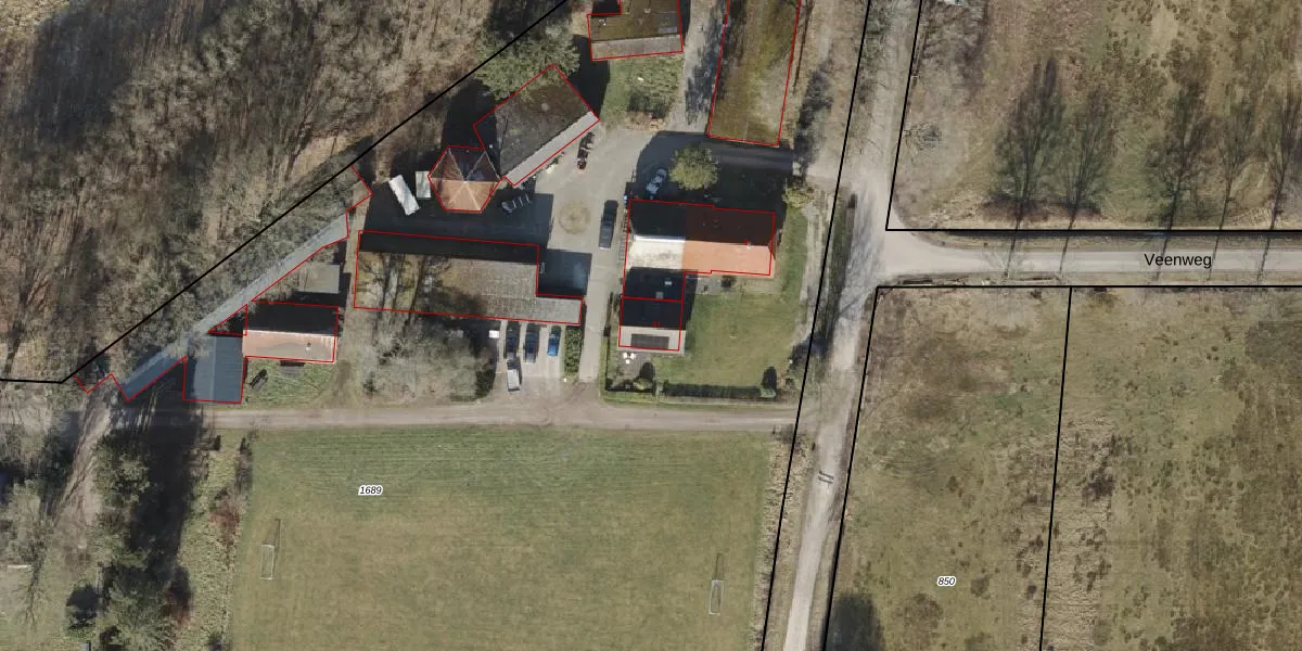 Het perceel waarop Veenweg 11 staat heeft een oppervlakte van 2,1 ha. Dit is een zeer groot perceel. De perceeloppervlakte wordt geregistreerd door het Kadaster. Gedetailleerde informatie over de maten van dit perceel kunt u vinden in het rapport Kadastrale kaart met maatvoering van Veenweg 11.