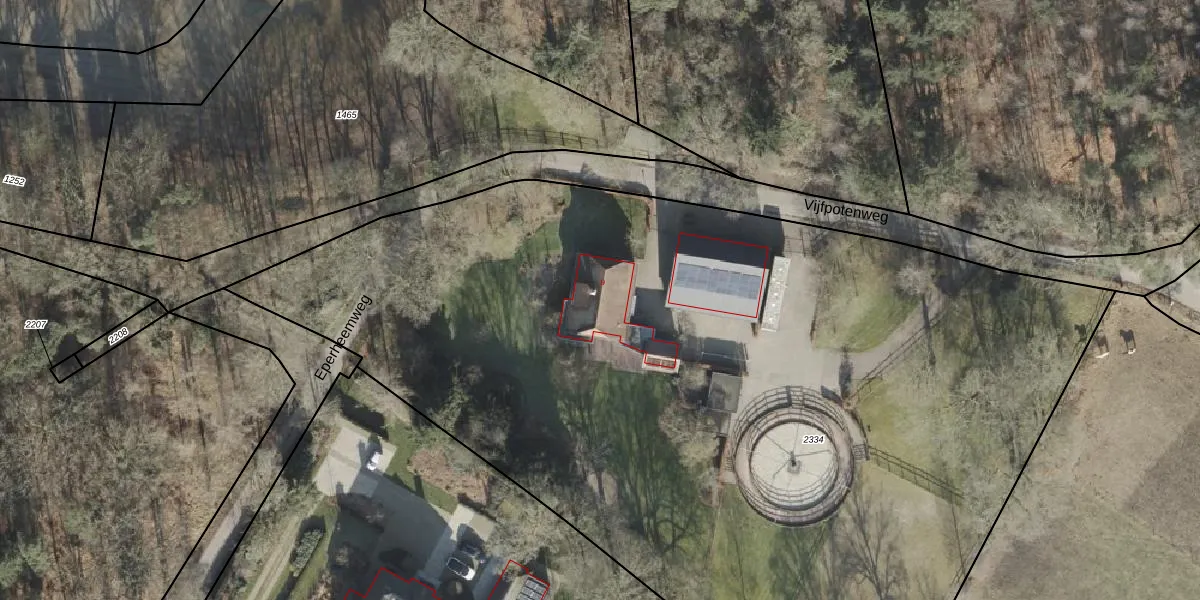 Het perceel waarop Vijfpotenweg 9 staat heeft een oppervlakte van 7218 m². Dit is een zeer groot perceel. De perceeloppervlakte wordt geregistreerd door het Kadaster. Gedetailleerde informatie over de maten van dit perceel kunt u vinden in het rapport Kadastrale kaart met maatvoering van Vijfpotenweg 9.