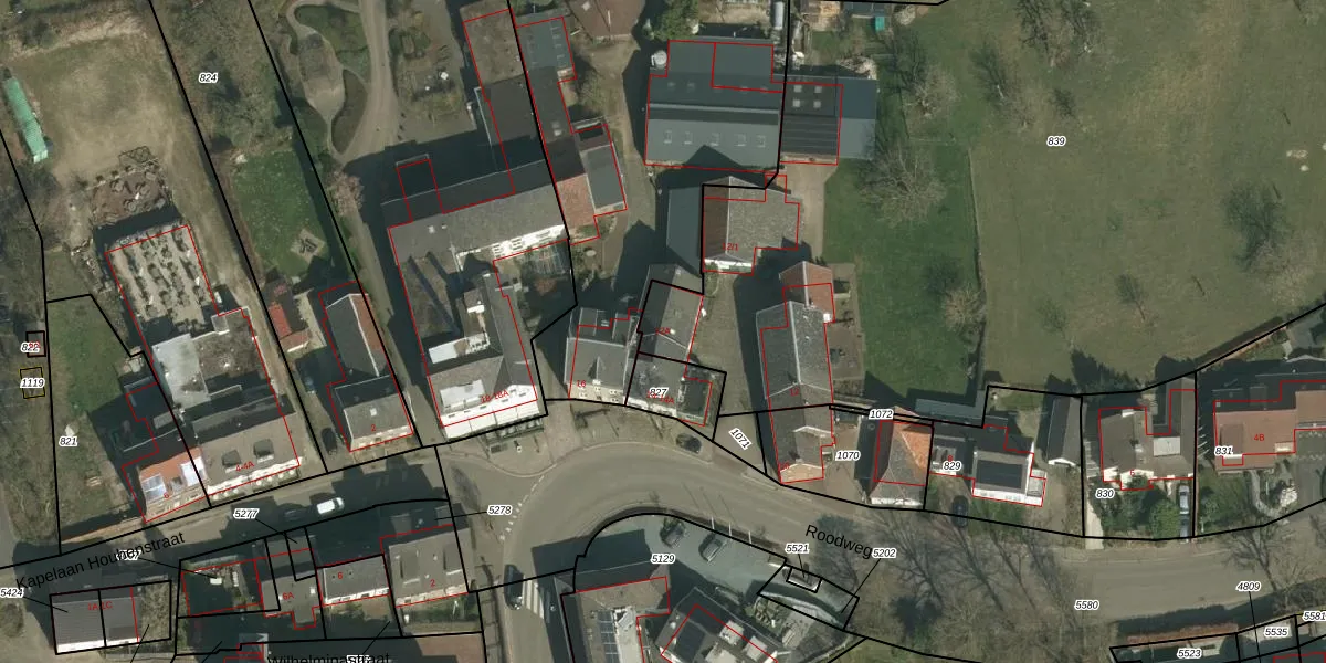 Het perceel waarop Roodweg 12-A staat heeft een oppervlakte van 8875 m². Dit is een zeer groot perceel. De perceeloppervlakte wordt geregistreerd door het Kadaster. Gedetailleerde informatie over de maten van dit perceel kunt u vinden in het rapport Kadastrale kaart met maatvoering van Roodweg 12-A.