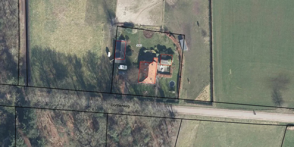 Het perceel waarop Dortherweg 31 staat heeft een oppervlakte van 2080 m². Dit is een zeer groot perceel. De perceeloppervlakte wordt geregistreerd door het Kadaster. Gedetailleerde informatie over de maten van dit perceel kunt u vinden in het rapport Kadastrale kaart met maatvoering van Dortherweg 31.