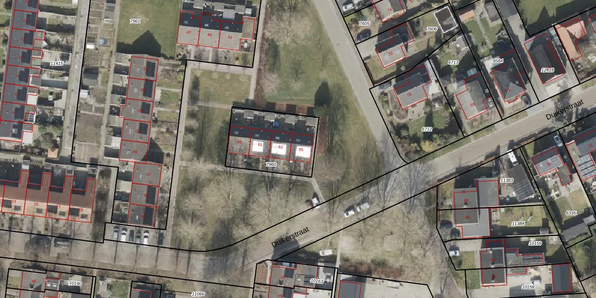 Duikerstraat 65 is gelegen op kadastraal perceel EMN00G7960. Deze kadastrale aanduiding is uniek en wordt gebruikt door het Kadaster om eigendomsrechten en andere zakelijke rechten vast te leggen. Het perceel maakt onderdeel uit van de kadastrale gemeente Emmen.