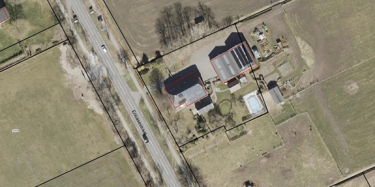 Ericasestraat 2 is gelegen op kadastraal perceel EMN00AG33. Deze kadastrale aanduiding is uniek en wordt gebruikt door het Kadaster om eigendomsrechten en andere zakelijke rechten vast te leggen. Het perceel maakt onderdeel uit van de kadastrale gemeente Emmen.